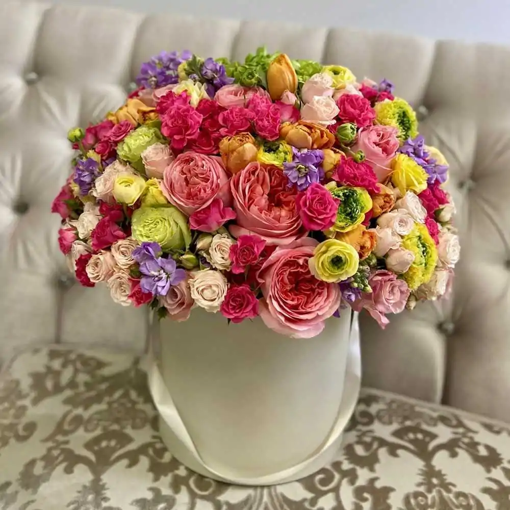 Данную композицию возможно сделать не только в коробке, но и в корзине или просто букетом.
